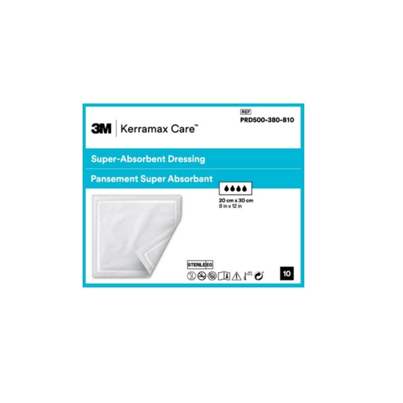 3M Kerramax Care Pansement Super Absorbant 20 cm x 30 cm est un pansement stérile et superabsorbant pour les plaies chroniques fortement exsudatives. Un exsudat chronique excessif peut ralentir la cicatrisation de la plaie.