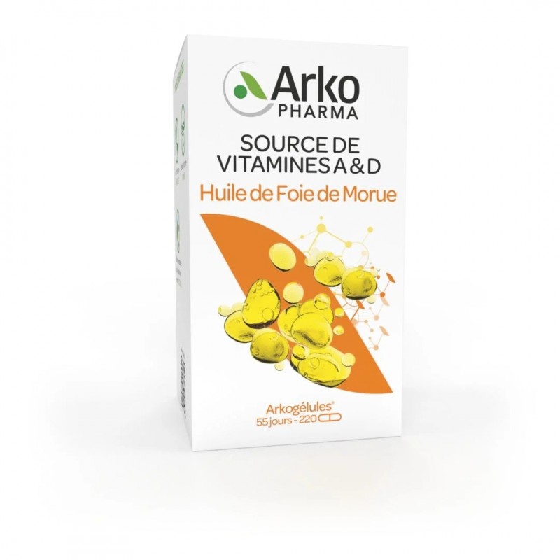 Arkogélules Huile de Foie de Morue 220 capsules est complément alimentaire destiné aux personnes désirant maintenir une ossature normale. L'Huile de Foie de Morue contient des vitamines A et D. La vitamine D est nécessaire à une croissance osseuse normale chez les enfants et au maintien d'une ossature normale chez l'adulte. L'apport journalier de 250 mg de DHA aide à maintenir de bonnes fonctions cérébrales, telles que les fonctions cognitives.
