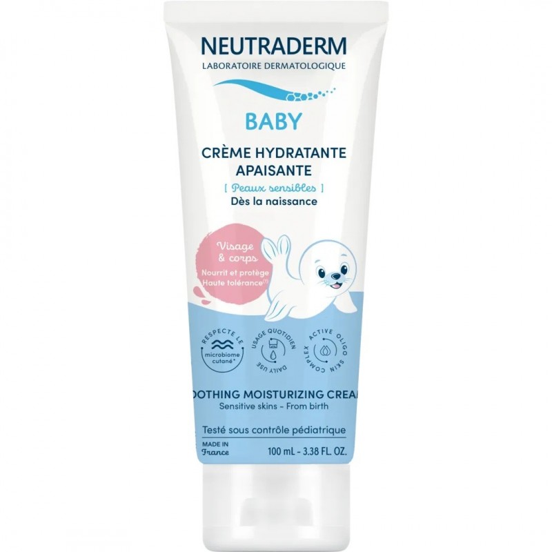 Neutraderm Baby Crème Hydratante Apaisante 100 ml hydrate le visage et le corps tout au long de la journée et laisse un film protecteur sur la peau des bébés. Sa formule extra-douce, au pH neutre et haute tolérance protège les peaux délicates et prévient des irritations. La peau est douce et délicatement parfumée. Grâce à son fini non collant, la crème hydratante bébé permet un habillage immédiat.