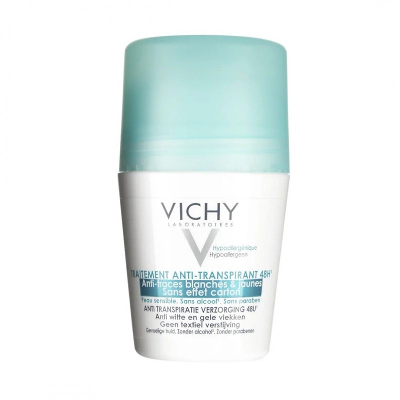 Vichy Déodorant Anti-Transpirant 48H Anti-Traces Roll-on 50 ml prévient l'apparition des traces jaunes sur les textiles clairs et des résidus qui peuvent les rigidifier. Anti traces blanches sur les textiles foncés.