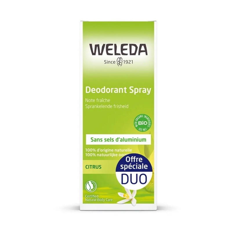 Weleda Déodorant Spray au Citrus 2 x 100 ml au délicieux parfum d’agrumes rafraîchit en respectant les fonctions naturelles d’élimination de la peau. Très rafraîchissant, ce déodorant aux huiles essentielles de citron et d'orange douce neutralise les odeurs corporelles désagréables tout en développant une agréable senteur fruitée. Sa formule naturelle ne contient pas d'actifs anti-transpirants, tels que les sels d'aluminium. Ce déodorant préserve les fonctions naturelles d'élimination de la peau. Tolérance cutanée testée sous contrôle dermatologique.