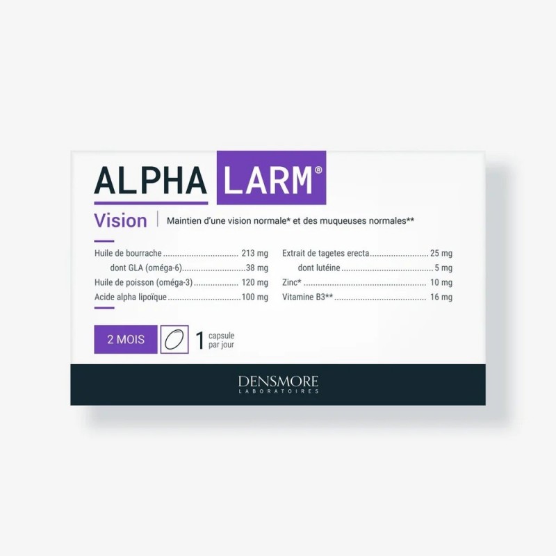 Densmore Alphalarm 60 Capsules est un complément alimentaire à base d’huile de poisson, d’argousier et de bourrache, acide alpha lipoïque, vitamines et minéraux.