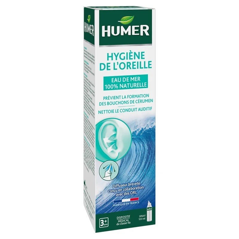 Humer Hygiène de l'Oreille 100 ml est un spray auriculaire à base d’eau de mer isotonique. Grâce à son diffuseur breveté, sans risque pour le tympan, il vous assure un lavage quotidien en douceur et en toute sécurité du conduit auditif externe. Sa formule à base d’eau de mer isotonique (concentration en NaCl à 9g/l) prélevée le long des côtes Bretonnes, permet au spray Humer Hygiène de l'Oreille :