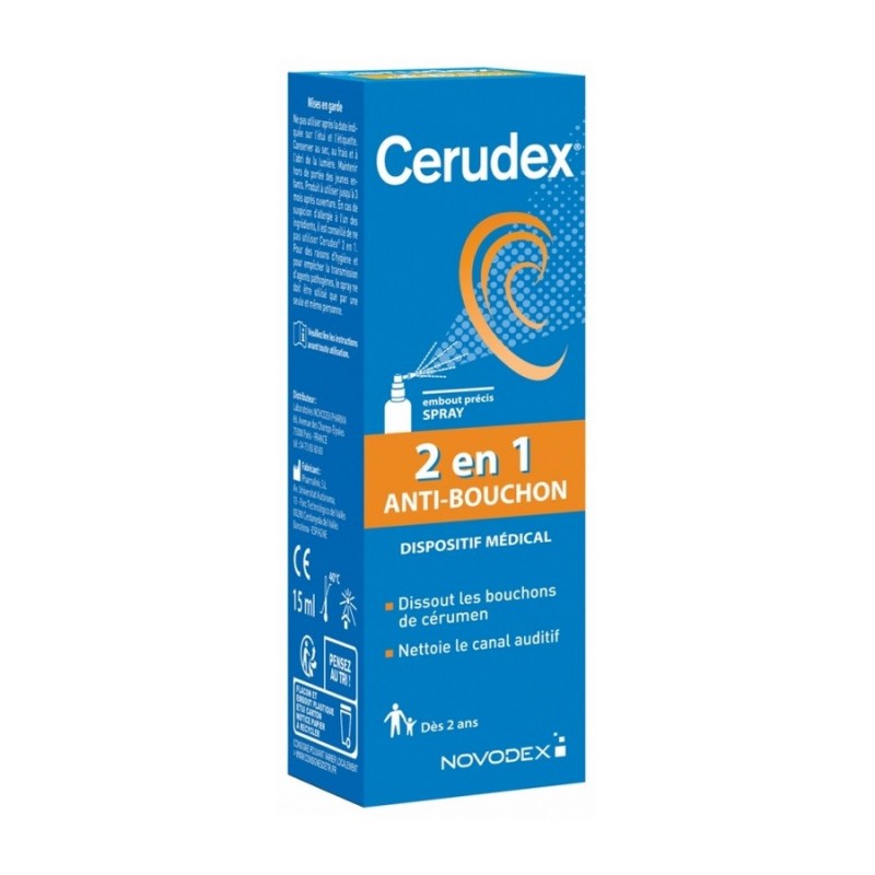 Novodex Cerudex 2en1 Anti-Bouchon 15 ml est un dispositif médical utilisable dès 2 ans, qui dissout les bouchons de cérumen et facilite leur extraction. Il est également destiné à nettoyer et à lubrifier le canal auditif pour prévenir la formation des bouchons de cérumen. Aromatisé au citron. Il ne contient pas de gaz propulseur.