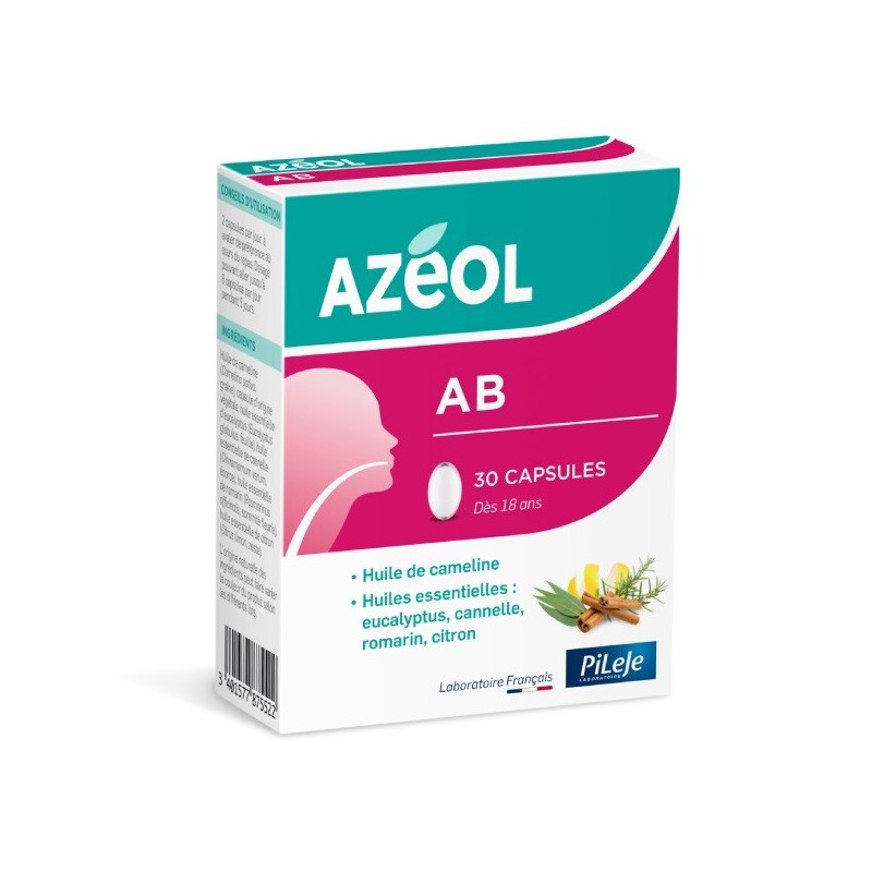 Pileje Azéol AB 30 Capsules est un complément alimentaire à base d'huile de cameline et d'huiles essentielles d'eucalyptus, de cannelle, de romarin et de carotte. Les compléments alimentaires Azéol AF et Azéol AB ont été formulés avec une huile de cameline obtenue selon le process quality silver qui garantit une qualité et une stabilité optimales de l'huile de cameline préservée au cours du temps.