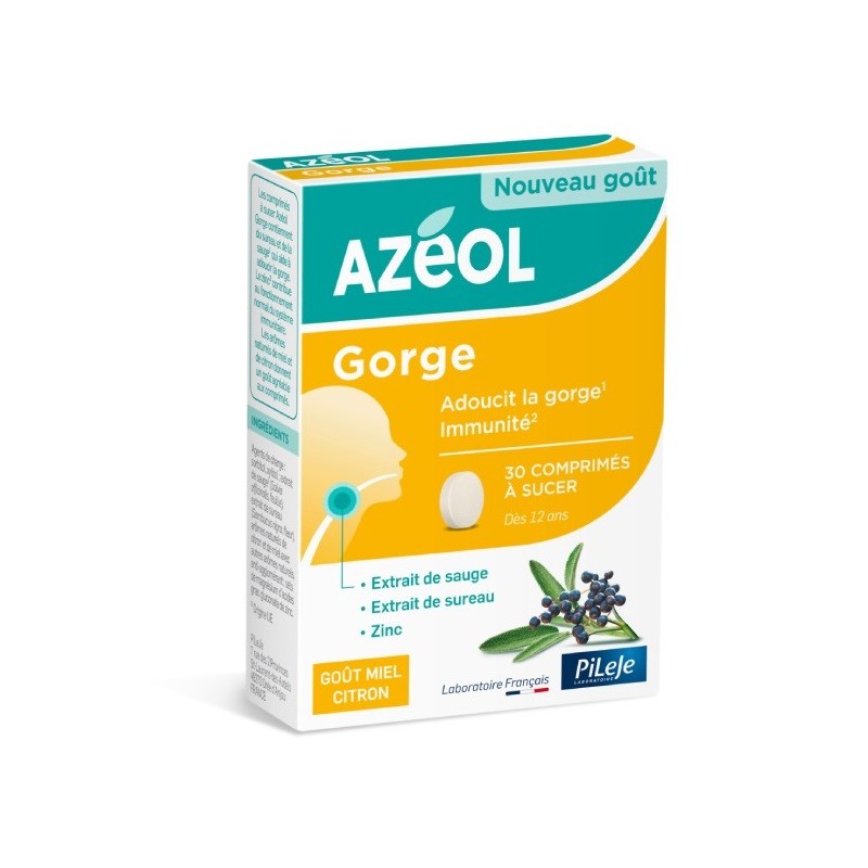 Pileje Azéol Gorge Comprimés à Sucer Miel Citron 30 Comprimés est un complément alimentaire à base d’extrait de sauge, d’extrait de sureau et de zinc. Au goût miel citron.