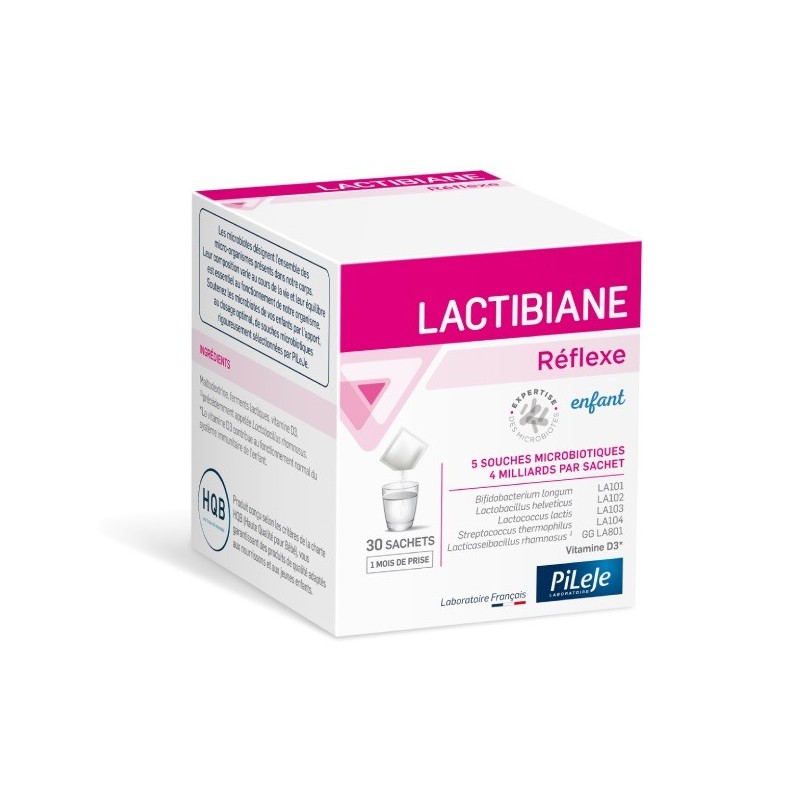 Pileje Lactibiane Réflexe Enfant 30 Sachets est un complément alimentaire destiné à apporter aux enfants cinq souches microbiotiques spécifiques, dosées à 4 milliards par sachet, ainsi que de la vitamine D3. La vitamine D3 intervient dans la croissance normale et le développement des os chez l'enfant. La vitamine D3 contribue également au fonctionnement normal du système immunitaire des enfants.