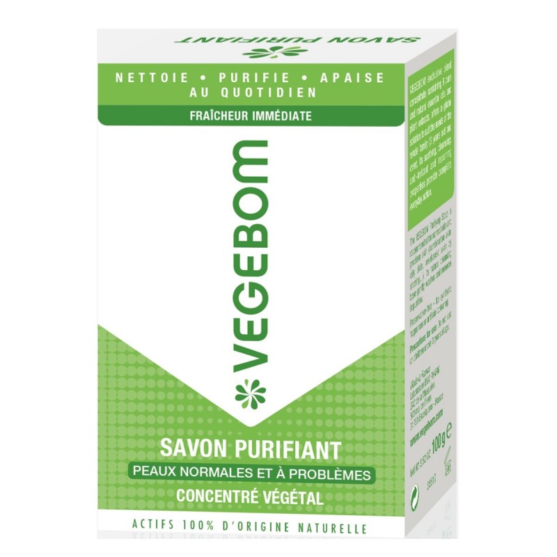 Grâce à sa base lavante végétale et au concentré végétal exclusif Vegebom, le Savon Purifiant Vegebom nettoie en douceur, assainit et apaise les peaux normales et les peaux à problèmes.