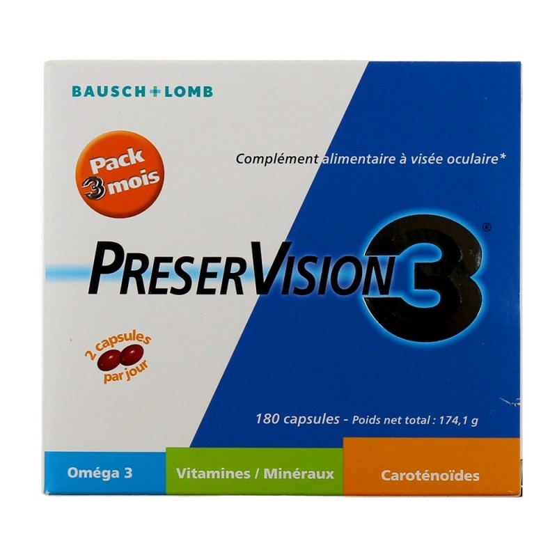 Bausch + Lomb PreserVision 3 180 Capsules est un complément alimentaire à visée oculaire. Il protège les yeux des soucis oculaires qui surviennent avec l’âge.