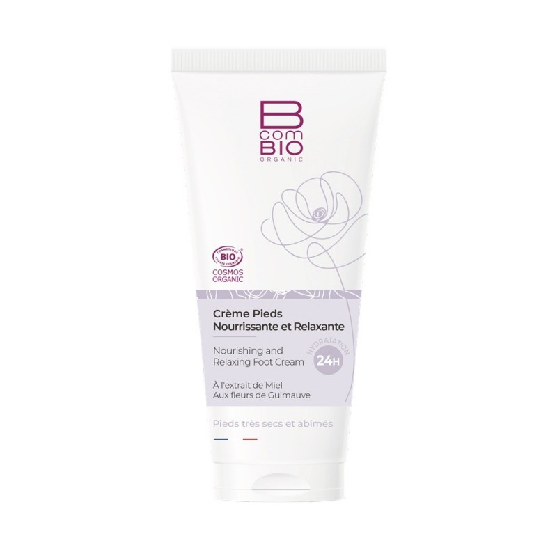 BcomBIO Crème Pieds Nourrissante et Relaxante Bio 100 ml nourrit et répare intensément les pieds très secs et abîmés (talons fendillés, callosités…). Les Fleurs de guimauve et l’aloe vera hydratent et redonnent à la peau douceur et souplesse. Un mélange d’huiles essentielles tonifiantes (menthe, lavandin…) délasse les pieds les plus fatigués. Sa texture fraîche pénètre instantanément sans laisser de film gras pour offrir une sensation de bien-être immédiate.