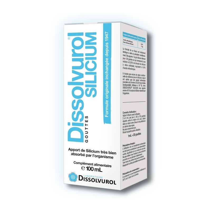 Dissolvurol Silicium Gouttes 100 ml apporte du silicium sous la forme la plus disponible pour l’organisme : l’acide orthosilicique, qui permet une assimilation optimale du silicium dans tous les tissus de votre corps et notamment la peau.