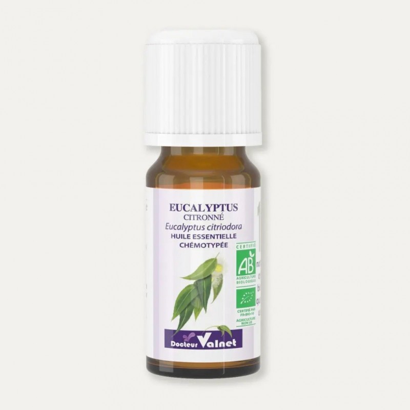 Docteur Valnet Huile Essentielle Eucalyptus Citronné 10 ml, 100% pure et naturelle issue de l'agriculture biologique, est une huile essentielle chémotypée botaniquement et biochimiquement définie.