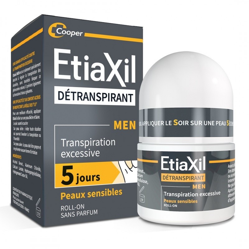 Etiaxil Détranspirant Men Peaux Sensibles Roll-On 15 ml traite efficacement la transpiration excessive des aisselles, tout en respectant les peaux sensibles. Une formule à la tolérance renforcée grâce au complexe protecteur CPx limite le risque d’irritations cutanées et maximise le confort des peaux sensibles. Etiaxil Détranspirant Men permet de stopper la transpiration pendant 5 jours et assure ainsi un contrôle total, anti-humidité et anti-odeur. Appliqué sur les aisselles, le produit permet de mettre au repos les glandes sudoripares, qui cessent alors de produire de la sueur pendant quelques jours. Sans parfum, ce produit est compatible avec l’usage d’un déodorant ou d’un parfum au quotidien.