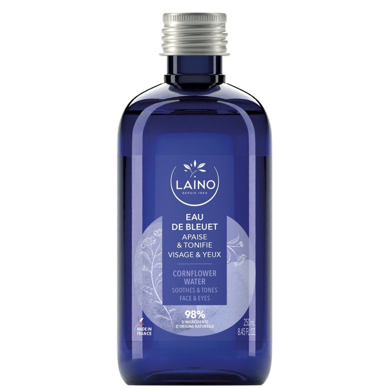 Laino Eau de Bleuet 250 ml rafraîchit et tonifie la peau. Elle est idéale pour défatiguer le regard. Elle convient à tous types de peaux et peut être utilisée comme un démaquillant ou une lotion tonifiante.