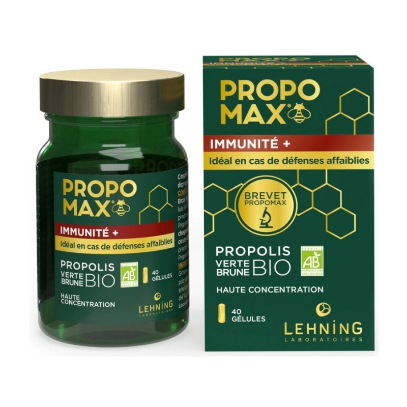Lehning Propomax Gélules Immunité 40 Gélules, à l'extrait de propolis pure bio (30%) contiennent un mélange breveté de propolis verte et brune. Ces gélules sont idéales en soutien et en prévention des défenses affaiblies, en particulier pour les changements de saisons.