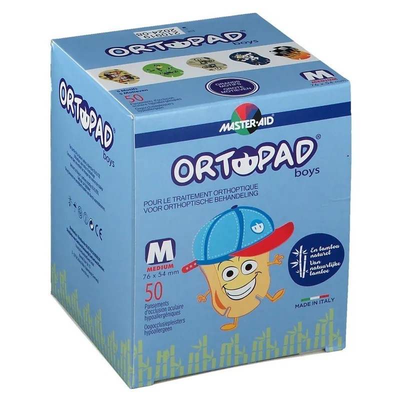 Ortopad Boys Grands Motifs est composé d’un non-tissé en bambou pur. Surface douce, sans pores et perméable à l’air pour un maximum de confort. La nouvelle forme anatomique avec fentes permet une adaptation parfaite au visage, surtout au niveau du nez. Garniture intérieure centrale très fine, douce et absolument opaque. Nouveau adhésif hypoallergénique, très facile à retirer.