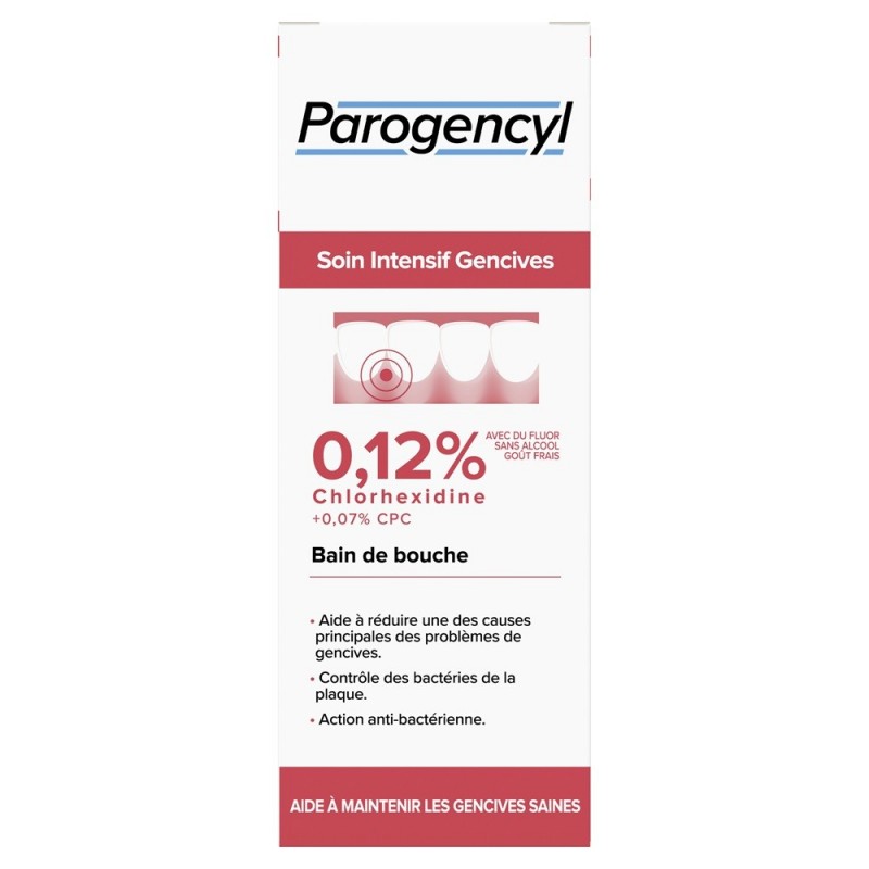 Parogencyl Bain de Bouche Soin Intensif Gencives 300 ml contient du fluor pour aider à renforcer l'émail. De plus il vous laisse un goût frais et agréable . Le complément idéal pour votre hygiène bucco-dentaire. Grâce à sa formule contenant du CPC et 0,12% de chlorhexidine, des actifs antibactériens, ce bain de bouche sans alcool vous aide à prendre soin des gencives. Il aide à réduire la croissance des bactéries de la plaque dentaire, responsable de l’inflammation gingivale occasionnelle.