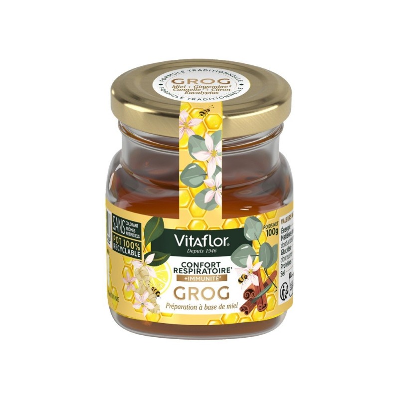 Vitaflor Préparation pour Grog 100 g est la préparation incontournable pour l'hiver. Le grog est une boisson traditionnelle incontournable de l’hiver, utilisée depuis des générations contre les désagréments hivernaux, dès les premiers signes de refroidissement (coups de froid, chatouillement de la gorge…), à la saveur gourmande d’épices, de citron et de miel. Facile, rapide et pratique : la formule santé et plaisir prête à l’emploi ! La cannelle pour favoriser le confort respiratoire, du gingembre, véritable allié pour maintenir les défenses immunitaires, et de l’huile essentielle d’eucalyptus qui vient compléter parfaitement cette formule.