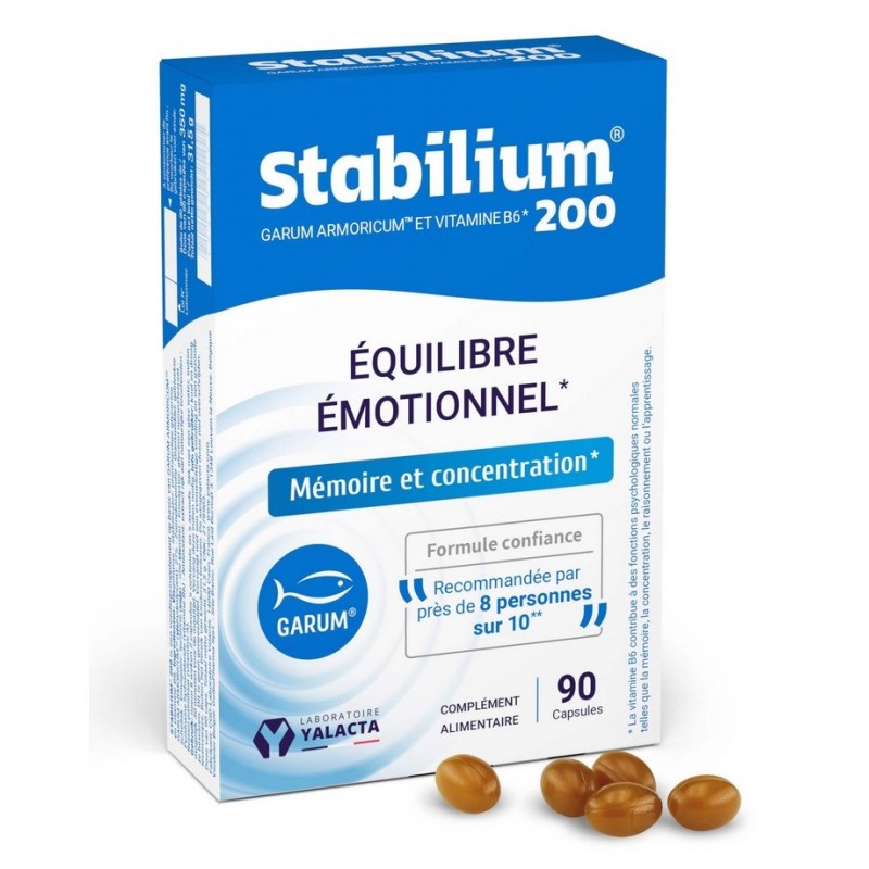 Stabilium 200 n’est pas un médicament. Il s’utilise en complément d’une alimentation équilibrée et variée. Ne pas laisser à la portée de jeunes enfants. Ne pas dépasser la dose journalière indiquée.