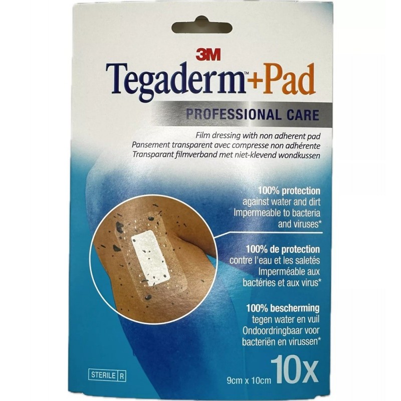 3M Tegaderm + Pad 10 x 9 cm x 10 cm is a film plaster with non-adherent pad to protect low exuding wounds. This transparent, sterile polyurethane dressing with pad is used to protect the epidermis aseptically, like a second skin. The flexibility of the plaster allows it to follow every movement of the epidermis right down to its smallest folds. It adheres firmly and durably to the epidermis thanks to a hypo-allergenic adhesive.