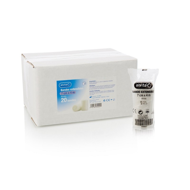 Alvita Stretch Bandage 7 cm x 4 m 20 Strips is used in joint traumatology and for securing and maintaining plasters. Available in several sizes, individually or in boxes of 20, they are washable and sterilisable, making them suitable for long-term hygienic use. They are also hypoallergenic and therefore suitable for the vast majority of patients with no risk of allergic reaction to any of its components.