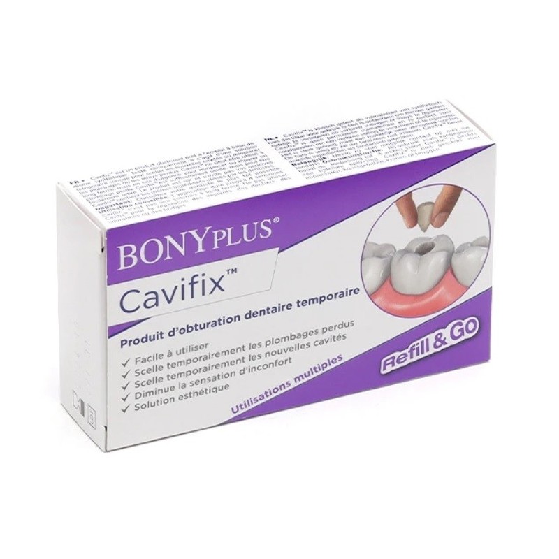 BonyPlus Cavifix 7 g is a composite used temporarily to fill a dental cavity, due to the loss of an amalgam (filling) or a cavity, while waiting for an appointment with the dentist.