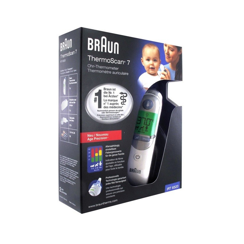 The Braun Thermoscan 7 IRT 6520 Ear Thermometer is a thermometer for babies, children and adults too, and has an age-adjustable fever indicator. This thermometer features professional technology that ensures consistently accurate temperatures and records the last 9 temperatures taken. It has an Age Precision colour-coded display, which allows you to set the person's age so that taking temperatures by age is more accurate. The colour-coded display automatically changes colour according to the temperature recorded. Unlike other ear thermometers, the Braun Thermoscan 7 IRT 6520 thermometer has a pre-warmed tip that prevents the temperature from cooling. Its positioning system lights up for greater accuracy, and an audible signal tells you that the device is correctly positioned for optimum temperature taking.