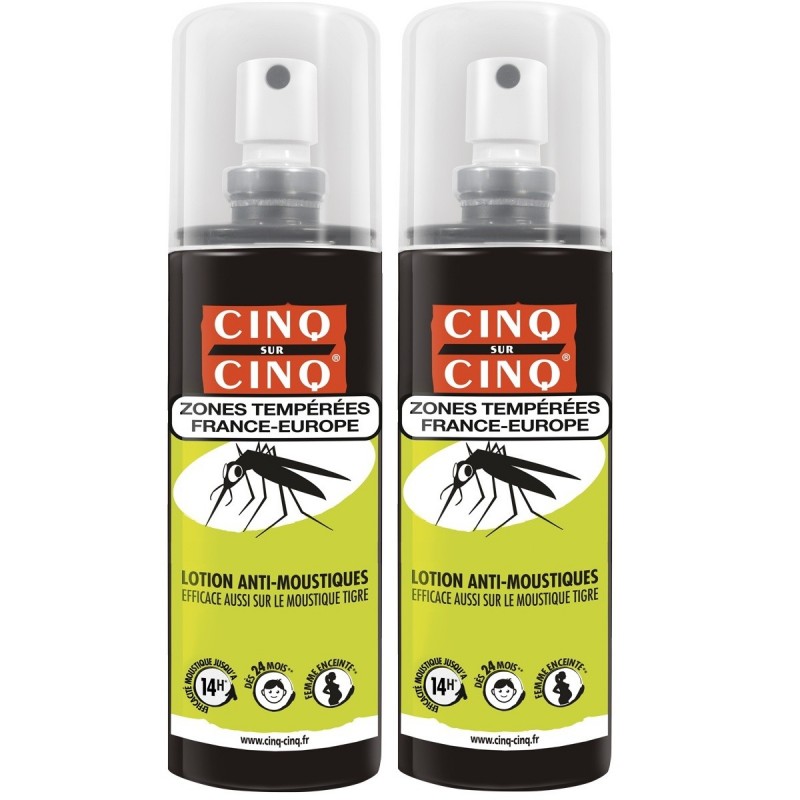 Cinq Sur Cinq Temperate Areas Anti-Mosquitoes Lotion 2 x 100ml effectively and immediately repels mosquitoes (including tiger mosquitoes), wasps, ticks and horseflies. it is one of the preventive measures against the vectors of malaria, dengue fever and chinkungunya in particular. This product is suitable for adults, pregnant women and children (aged 24 months and over) and is effective for several hours.