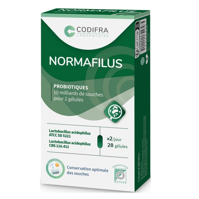 Codifra Normafilus 28 capsules is a dietary supplement based on lactic ferments. Codifra Normafilus contributes to intestinal comfort in the case of sensitive intestines (bloating, flatulence, alternating diarrhoea-constipation).