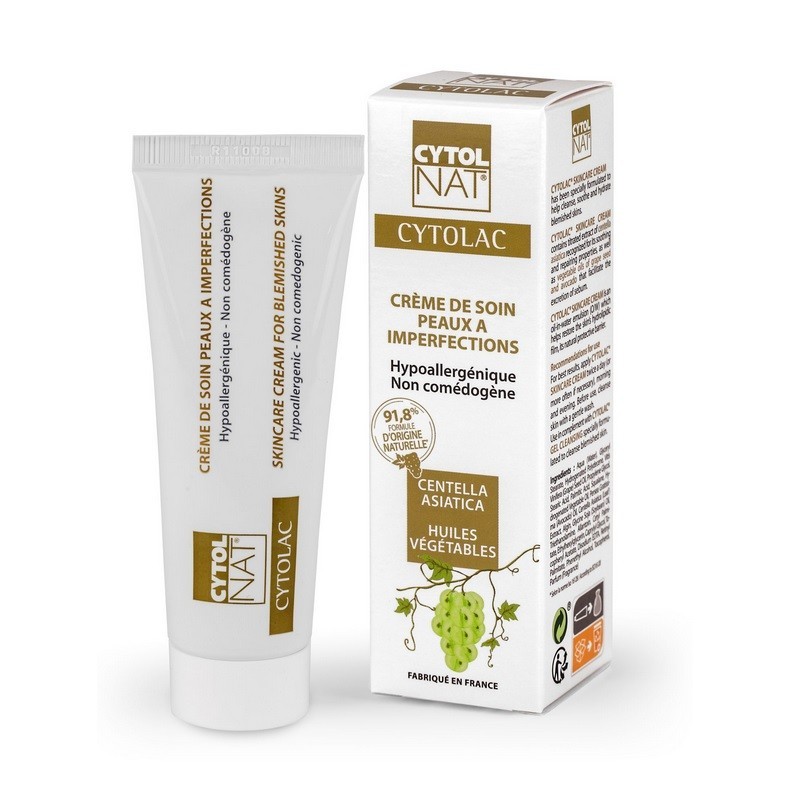Cytolnat Cytolac Skincare Cream for Blemished Skins 50 ml purifies, soothes and moisturises acne-prone skin. It is recommended for oily skin with a tendency to acne to repair, moisturise, soothe and refine the texture of the skin. The cream is not drying and is ideal for young women or men undergoing acne treatment.