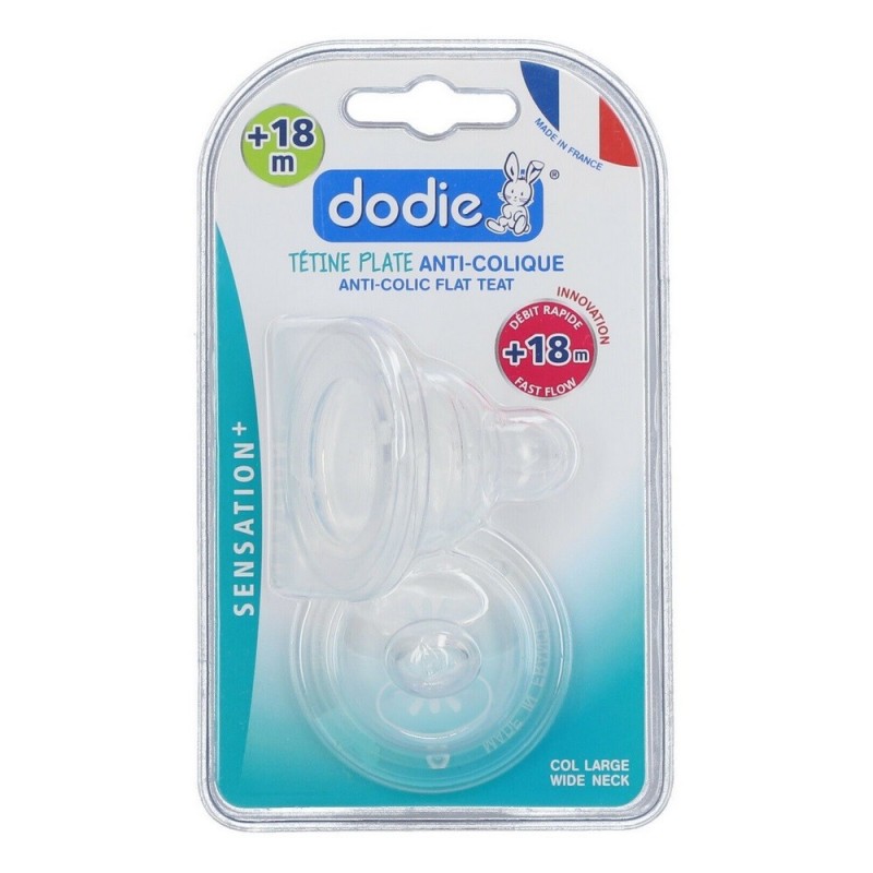 Dodie Sensation+ Flat Teat Anti-Colic +18 months Flow +18 Months in silicone. The anti-colic system is integrated into the teat thanks to a patented valve that promotes air circulation and reduces the risk of colic, aerophagia and regurgitation. Sensation+ teats fit all Dodie wide-neck baby bottles (Sensation+ and Initiation+ ranges).