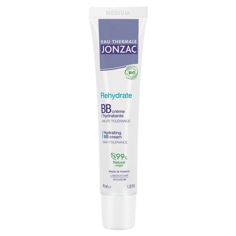 Eau Thermale Jonzac Rehydrate Hydrating BB Cream Tinted Medium 40 ml intensely hydrates, evens, illuminates, smoothes and protects the skin immediately and in a single step. Its light texture infused with natural mineral pigments evens out the complexion and blurs imperfections without marking the skin's micro-reliefs (fine lines, pores, etc.) for a natural, comfortable finish all day long. Non-comedogenic.