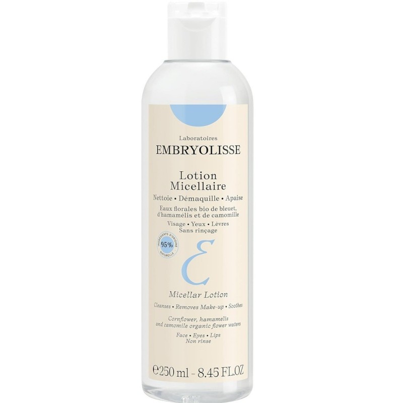 Embryolisse Micellar Lotion 250 ml is a soothing cleansing make-up remover for the face, eyes and lips. For all skin types. For all skin types. The fast, convenient way to cleanse and remove make-up completely from the face, eyes and lips with just one product. The micellar lotion is suitable for the most sensitive skin thanks to its extreme gentleness: micelles (gentle cleansing agents) in solution in cornflower, chamomile and witch hazel waters combined with glycerine to soften, soothe and tone the skin. Highly tolerated by the skin and eyes, yet highly effective. It comfortably removes all impurities and daily pollution, as well as all traces of make-up, even waterproof make-up.