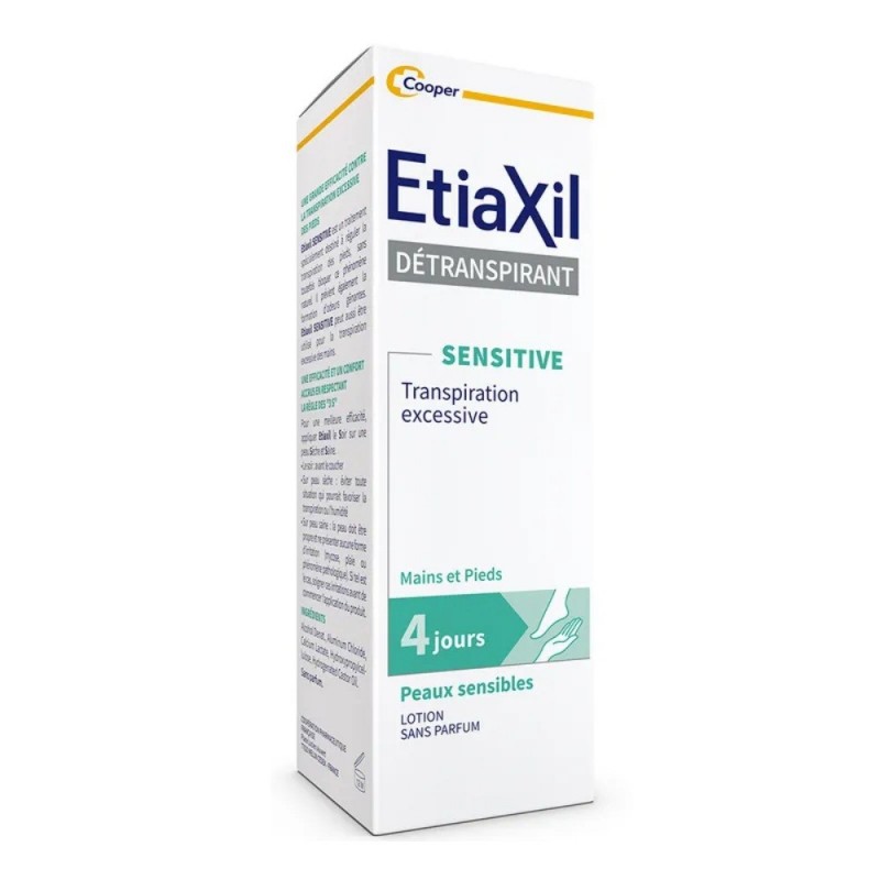 Etiaxil Antiperspirant Excessive Perspiration Treatment Feet Sensitive Skin 100 ml has been designed to effectively treat excessive perspiration on the feet while respecting sensitive skin. This lotion can also be used to treat excessive perspiration on the hands or targeted areas of the face. It is clinically proven to stop perspiration for 3 to 5 days. Applied to the skin, the product rests the sweat glands, which then stop producing sweat for a few days. A formula with enhanced tolerance thanks to the CPx protective complex limits the risk of skin irritation and maximises comfort for sensitive skin. Scented-free, this product is compatible with the use of a deodorant or perfume on a daily basis.