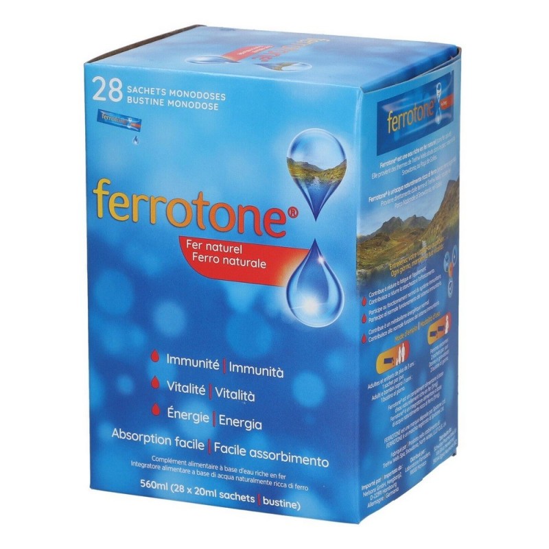 Ferrotone Original Natural Iron 28 Sachets is naturally sourced iron-rich water from the mountains of Snowdonia, Wales - nothing else has been added. Iron contributes to a normal energy metabolism, maintaining a normal immune system and reducing fatigue and exhaustion. It is suitable for the whole family (children over 3), including pregnant women.