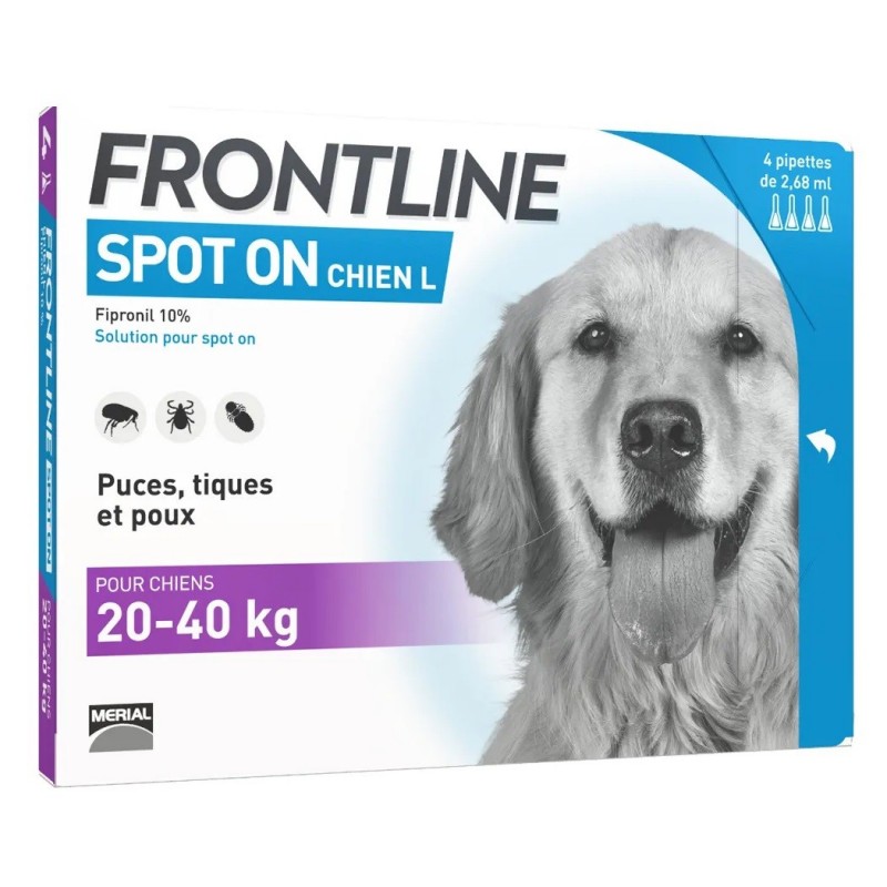 Frontline Spot-On Dog L (20 to 40 kg) 4 Pipettes eliminates adult fleas and ticks. Applied in one spot to your pet's skin, Frontline Spot-On Dog L works in less than 24 hours, providing continuous protection.