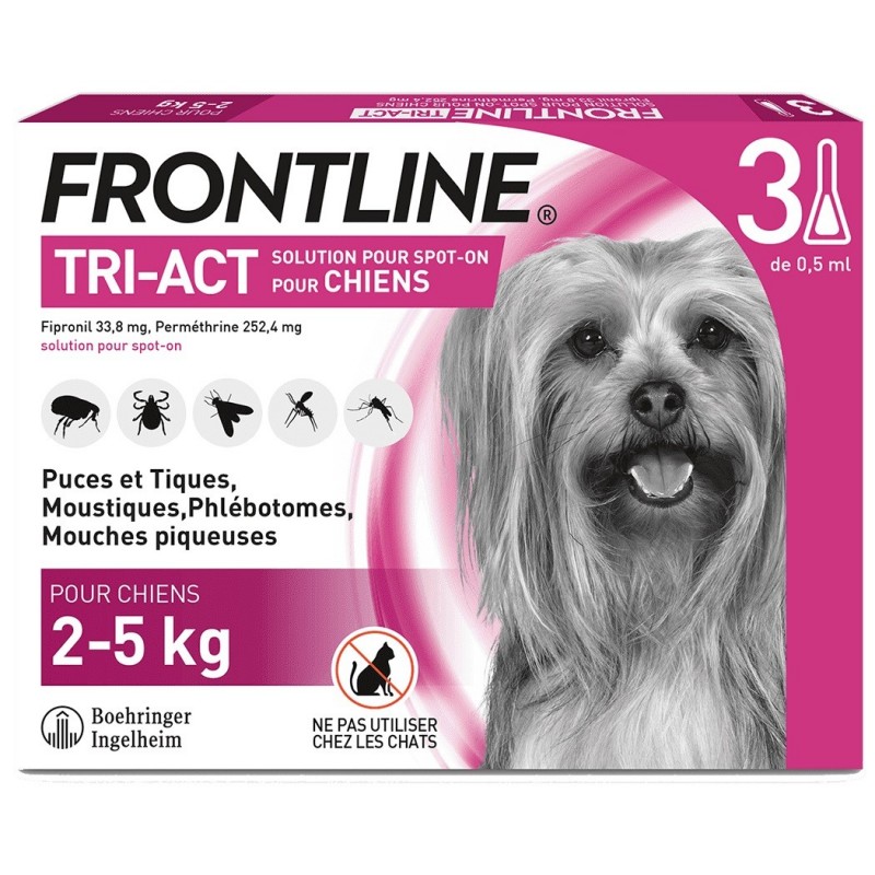 Frontline TRI-ACT Dogs 2-5kg 3 Pipettes is a tick and flea treatment for dogs with a radical effect against 5 parasites (fleas, ticks, mosquitoes, sandflies and biting flies). It also kills fleas before they lay their eggs.