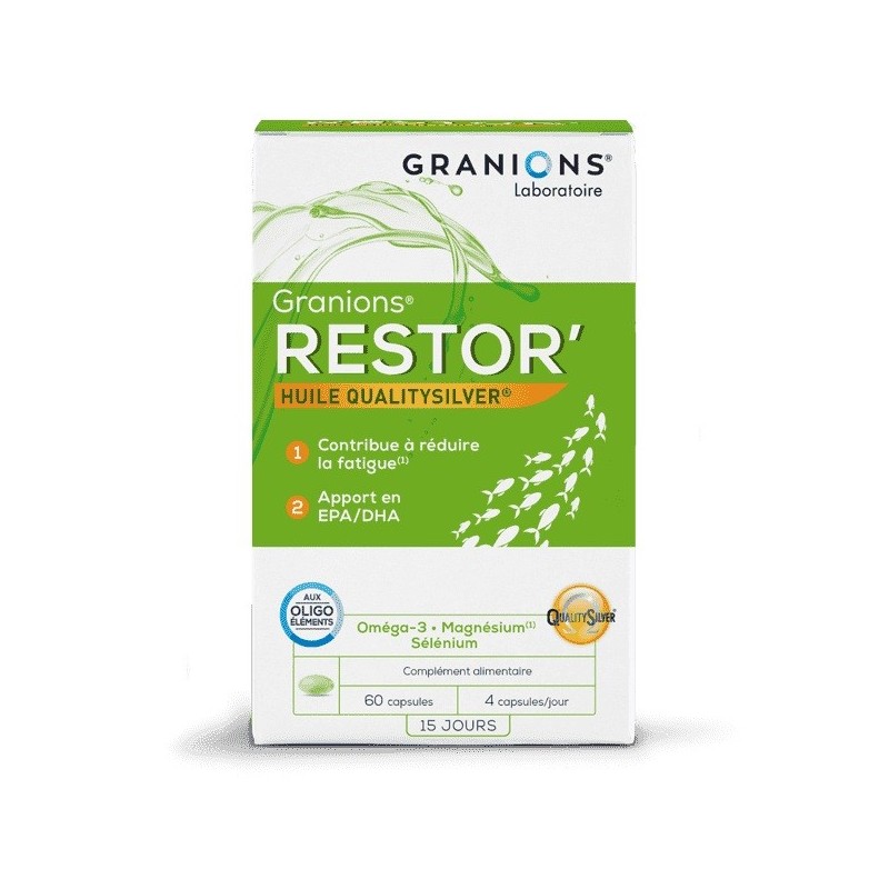 Granions Restor' 60 Capsules promotes a balanced diet between omega-6 and omega-3 (EPA and DHA, which are essential for healthy brain function) and provides trace elements such as magnesium and selenium.