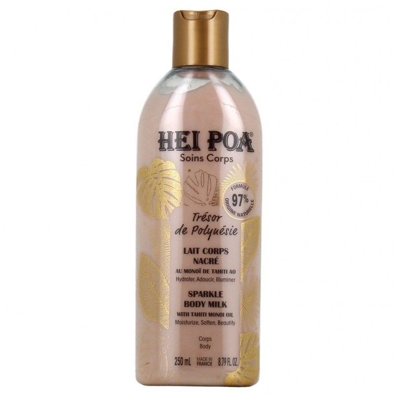 Hei Poa Body Care Treasures of Polynesia Sparkle Body Milk 250 ml moisturises, softens and protects the skin for 24hrs. The pearlescent particles illuminate the skin without leaving a greasy finish. Enriched with Tahiti Monoï AO, sensations of irritation and tightness are immediately soothed, and the skin regains all its comfort.