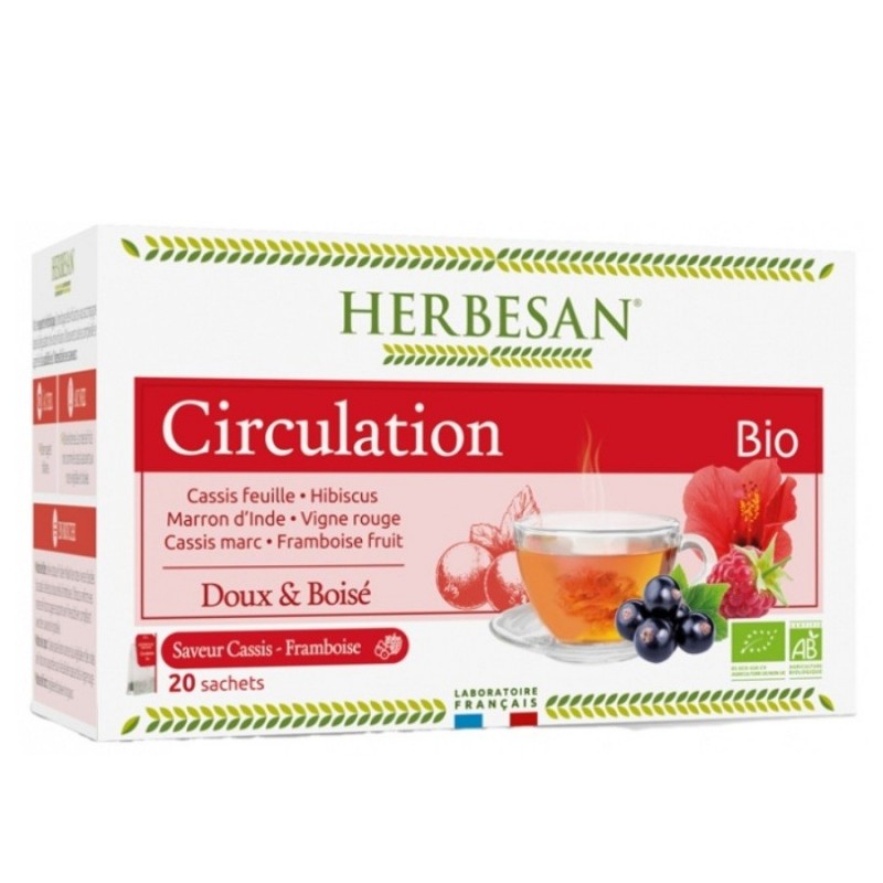Herbesan Infusion Circulation 20 Sachets is an infusion made from blackcurrant, hibiscus, horse chestnut, red vine, blackcurrant and raspberry. Blackcurrant supports circulation. Hibiscus also supports microvascular circulation and is traditionally used to promote a feeling of lightness in the legs. Blackcurrant and raspberry flavour.