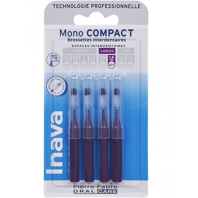 Inava Mono Compact 4 Interdental Brushes Purple 1.8 mm cleans interdental spaces. Technical, precise and easy to use: the Inava Mono Compact interdental brushes and their 2 bristle diameters make it easy to clean hard-to-reach spaces between teeth. Designed for effective interdental cleaning, Inava Mono Compact interdental brushes complement daily oral hygiene routines and are particularly recommended for people with implants, orthodontics or bare dental necks. Their use helps to reduce the formation of dental plaque, which can lead to cavities and gingivitis, and consists of a simple, gentle insertion, followed by a few back-and-forth movements. The black bristles of the brush, which contrast with the whiteness of the teeth, make insertion easier and allow you to see what deposits have been removed. The white bristles indicate occasional bleeding. Simply clean the brush (with a little mouthwash, for example) and put it away for future use. To avoid forcing the interdental insertion, the choice of brush size is essential. The range therefore comprises 8 references ranging from the thinnest (ISO 0) to the widest (ISO 7), recognisable by their different colours and available in packs of 4.