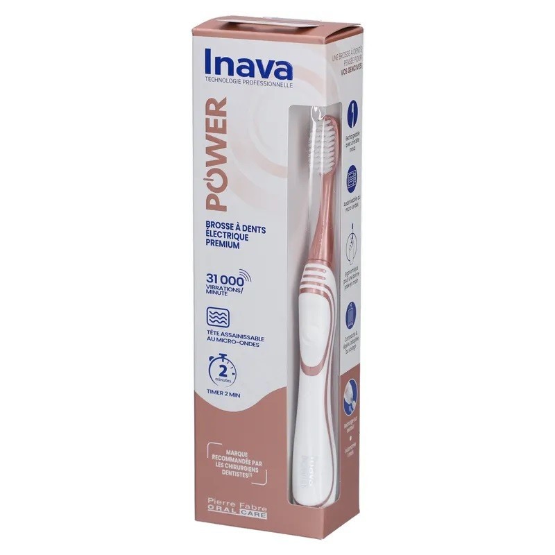 Inava Power Premium Electric Toothbrush Pink is lightweight and compact. It combines the effectiveness of sonic technology with the softness of a manual toothbrush Inava. Suitable for sensitive teeth and gums. Hard-to-reach areas and interdental spaces are reached more easily, with up to 10 times more plaque removed than with a conventional manual toothbrush. The sonic electric toothbrush's built-in timer signals every 30 seconds when the area to be brushed changes, for even greater precision. The ergonomic design of the handle - three times lighter than most electric toothbrushes on the market - and the unique shape of the Inava heads mean that the manual brushing movement is retained, for optimal brushing for sensitive gums and teeth.