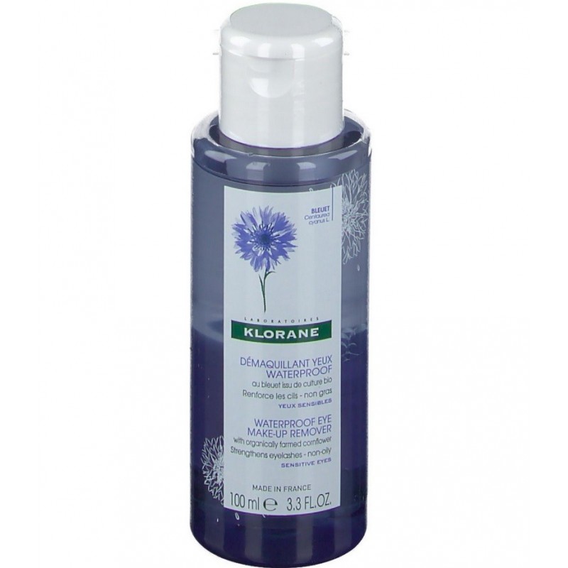 Klorane Waterproof Eye Make-Up Remover with Cornflower 100 ml is rich in cornflower floral water. This waterproof eye make-up remover combines effectiveness and gentleness. Its exceptionally fluid, two-phase formula quickly removes all types of long-wearing make-up, even waterproof, without rubbing. Its non-greasy texture leaves the eye area soft and soothed, while strengthening the lashes. Suitable for sensitive eyes and contact lens wearers. Free from silicone, paraben and phenoxyethanol. Ophthalmologist-tested.