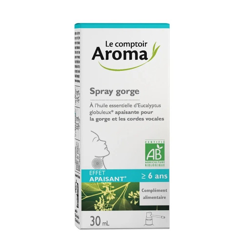 Le Comptoir Aroma Throat Spray 30 ml is a dietary supplement based on honey, propolis extract, purple echinacea, sage, plantain and eucalyptus globulus essential oil that soothes the throat, pharynx and vocal cords.
