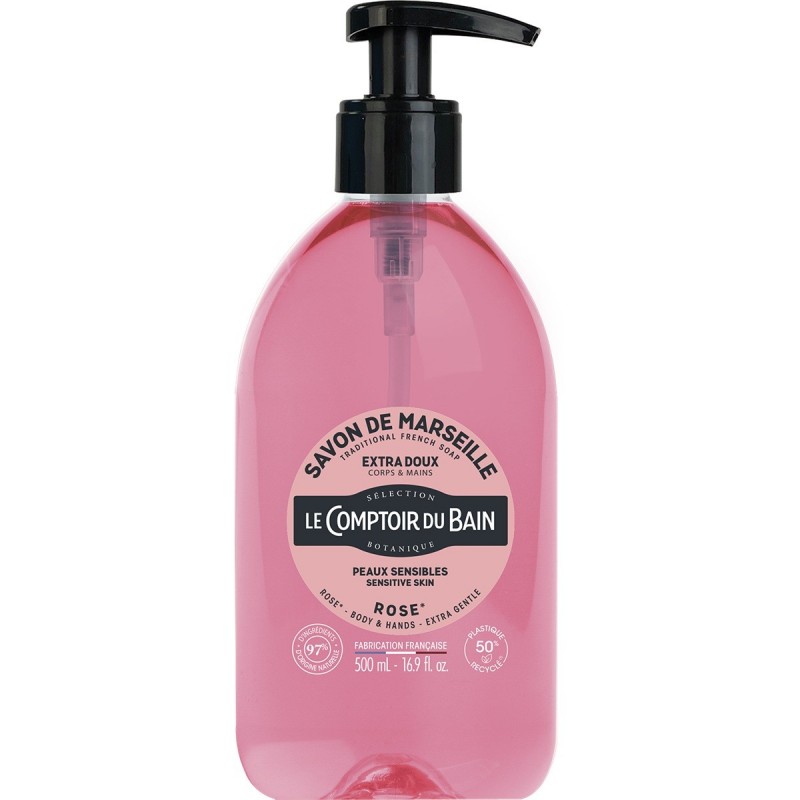 Le Comptoir du Bain Savon de Marseille Rose 500 ml gently and effectively cleanses. The refined and elegant floral bouquet leaves skin delicately scented. Ideal for sensitive skin. Maintains softness and is suitable for frequent hand washing. Can also be used on the body. The base of this soap is derived from the saponification of natural vegetable oils. The texture and colour of this soap may change slightly, but this in no way affects its quality. No preservatives. Free from animal fats.