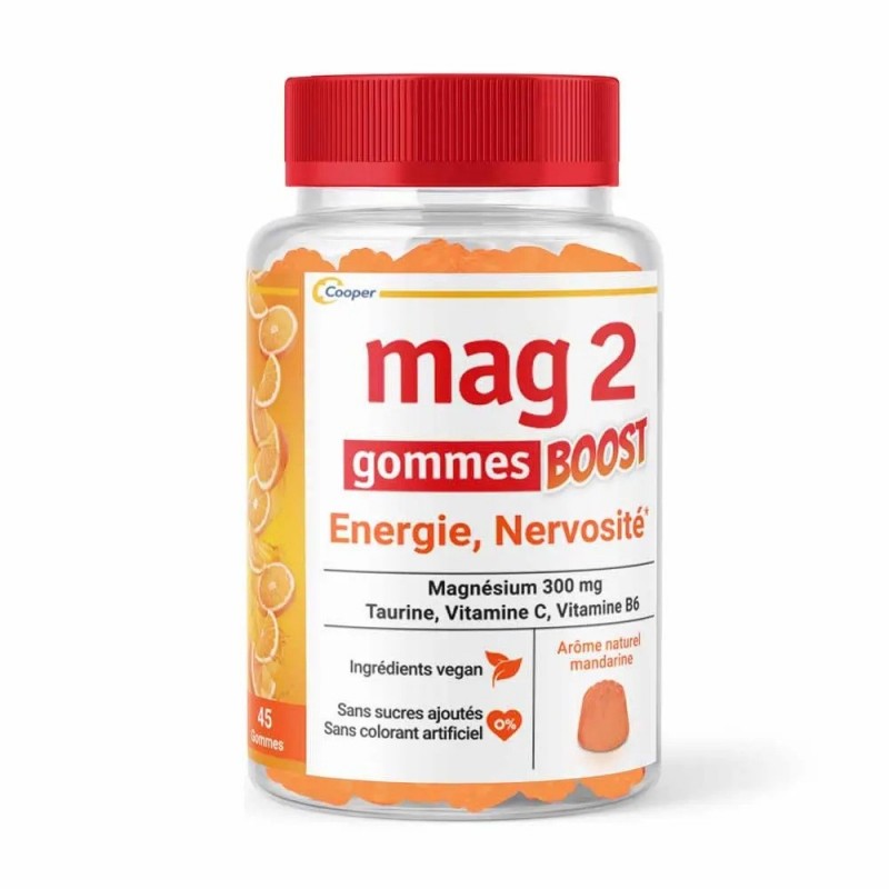 Mag 2 Boost Energy and Nervousness 45 Gummies helps combat fatigue. An innovative formula specially designed with magnesium, vitamin C and vitamin B6 to reduce the stresses of everyday life and restore your well-being. No added sugar or artificial colourings.