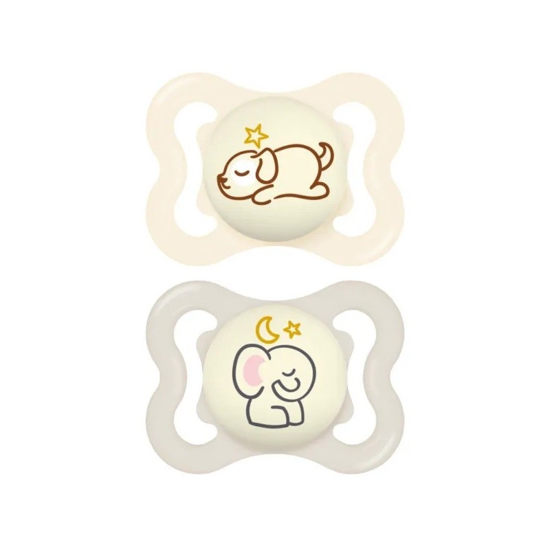 Mam Supreme Night 2 Silicone Soothers 2-6 Months contributes to baby's healthy oral development and glows in the dark.
