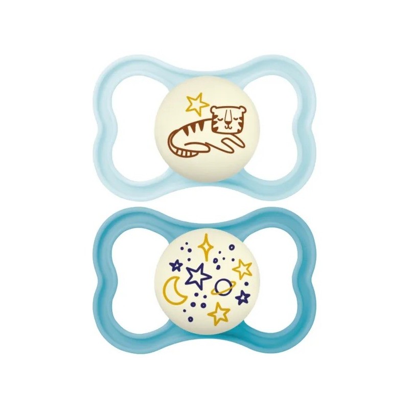 Mam Supreme Night 2 Silicone Soothers 6+ Months contributes to baby's healthy oral development and glows in the dark.