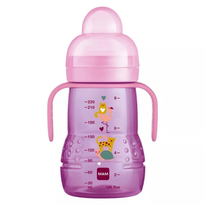 Mam Trainer Baby Bottle 220 ml Pink has been designed to give baby peace of mind when drinking. Thanks to its ergonomic handles, it's easy to find and hold.