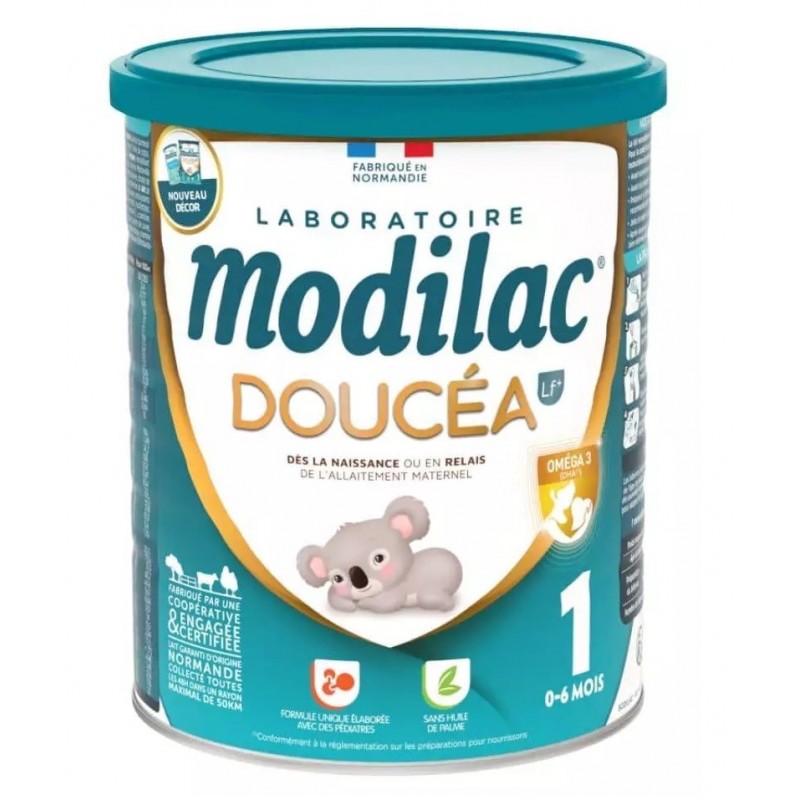 Modilac Doucéa 1 0-6 Months 820 g is a formula for infants, formulated to meet their specific nutritional needs, from birth or as a relay to breastfeeding. The unique formula of this infant formula has been developed in collaboration with paediatricians. It contains no palm oil and, in accordance with regulations, includes DHA, an essential fatty acid in the Omega 3 family.
